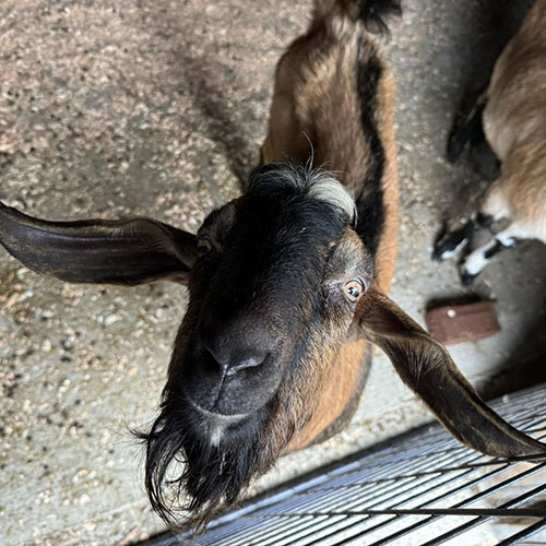 Patty was transferred into our care in the fall of 2021 and is currently in foster care.  Patty is vigilant and very tiny; we call her “tiny, but mighty.”  She will intently stand at a distance or peek around a corner to assess your behaviour toward another herd member.  She is diminutive, and as the sole horned member of her herd, the toughest.  Both of the sheep in her herd, Chester and Elliot, are three times her size, but will let her have her way, or just run from her.  When all is copacetic, she will stand with her forehead on one of the sheep for a few moments, then turn and slowly walk away.  If you pass her protracted behaviour assessment, she will show her approval and bestow upon you kisses that will melt your heart and make your day.  Another nickname for her is “Gassy Patty,” as she regularly emits from both ends.