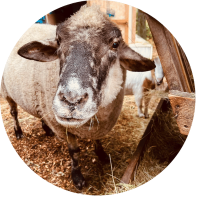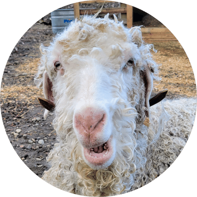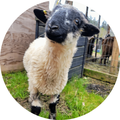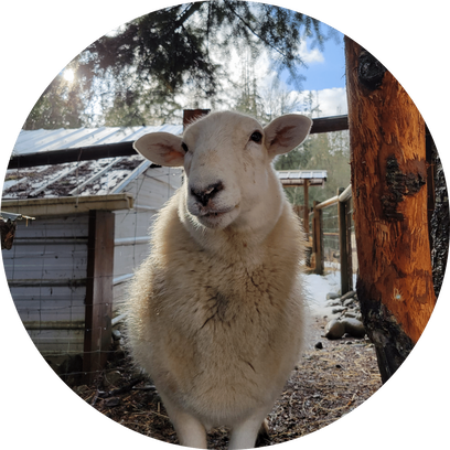 Sam was transferred into our care in the fall of 2021.  Sam was essentially born blind due to large cataracts that developed in utero.  His blindness saved his life because he was surrendered into sanctuary instead of being slaughtered as a lamb.  As Sam grew and his eyes got bigger, he was able to see around his cataracts and gained his vision back.  Sam is very rambunctious and will give you a good head butt if he’s in the mood, but he is also a snuggler when the mood strikes too!