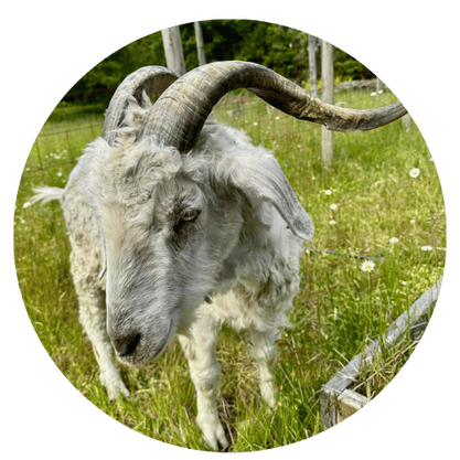 Simon was transferred into our care in the fall of 2021 and is currently in foster care.  Simon is the senior of the herd and hangs with Ziggy.  These two are the long-haired easygoing hippies of the group.  A golden wave crashes over Simon’s hind quarter, which gives him a groovy handsomeness, and he seems to know it.  When you stroke or scratch his wave, his tail wags like a fast windshield wiper.  When he arrived in our care, we were told that Simon was a “lemon” or relatively fragile.  He does have some joint issues and is sometimes reluctant to get up unless there are treats involved.  He will often lie alone or with his pal, Ziggy.  That being said, when the fun starts, and rearing up and head-butting is on the menu, he definitely demonstrates his ramming experience.